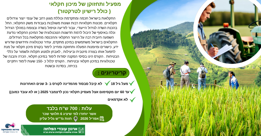הקורס מהווה בסיס ללימוד מיכון חקלאי וכולל כ־150 שעות לימוד, ויתקיים בחוות גד”ש גליל עליון.