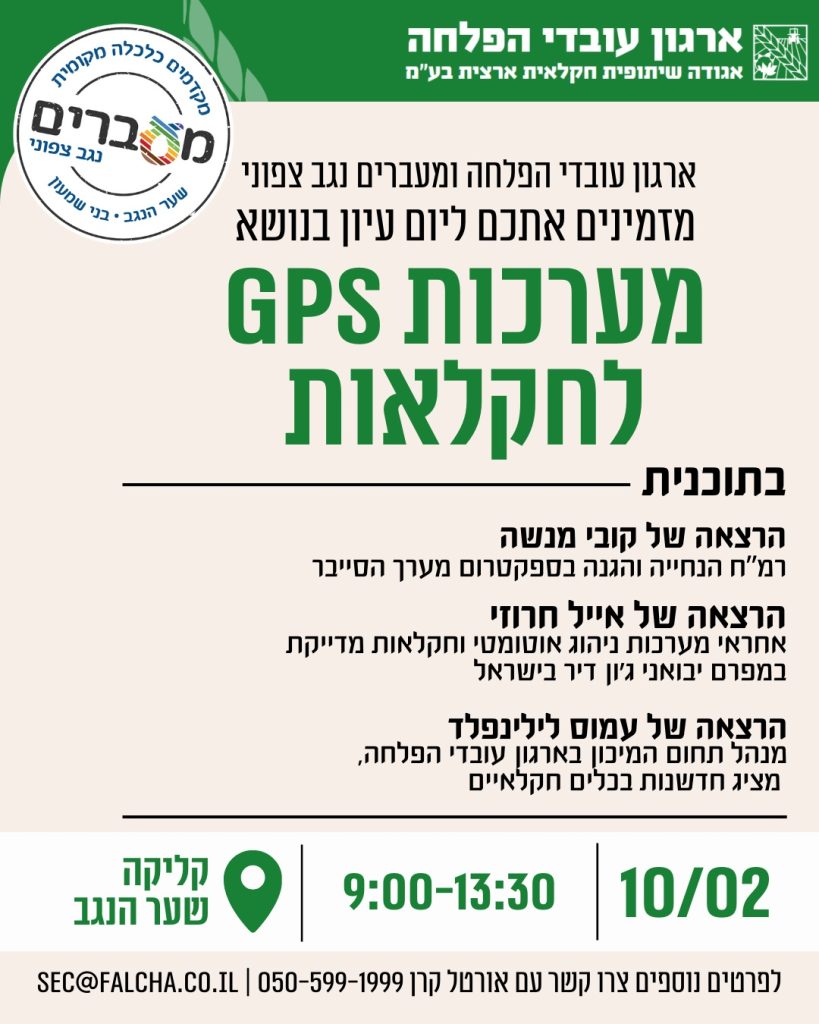 ארגון עובדי הפלחה בשיתוף מעברים נגב צפוני מזמינים אתכם ליום עיון מקצועי ומרתק בנושא מערכות GPS והחידושים המשפיעים על הדיוק, הבטיחות והיעילות בעבודה החקלאית.