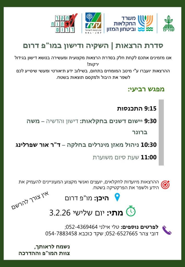 סדרת הרצאות – השקיה ודישון במו”פ דרום פברואר 2026