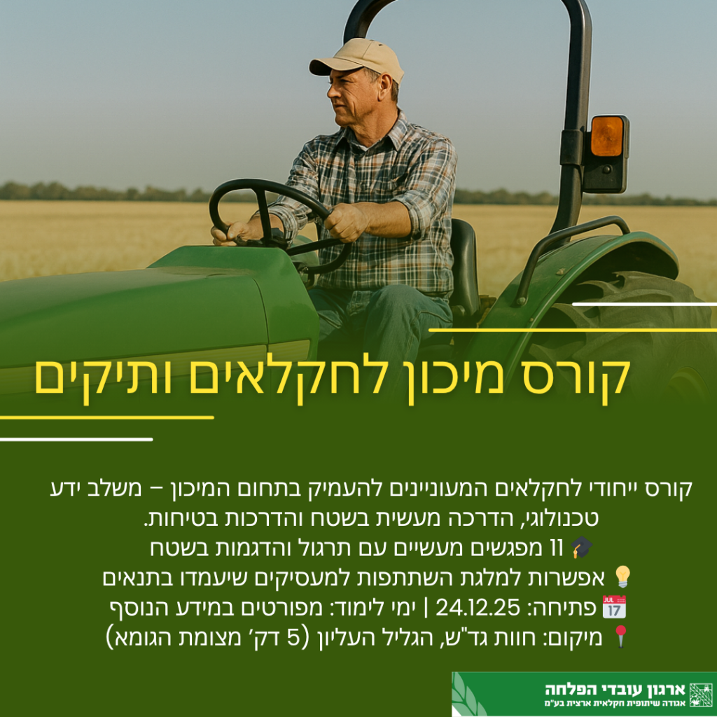 קורס ייחודי המיועד לחקלאים עם נסיון המתעניינים בתחום המיכון. הקורס משלב תכנים טכנולוגיים, הדרכה מעשית בשטח והדרכות בטיחות – וכולל תעודת סיום