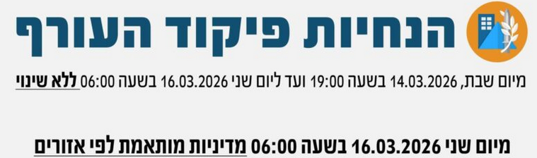 החל מיום שני, 16 במרץ 2026, בשעה 06:00, תיכנס לתוקף מדיניות התגוננות המחלקת את אזורי