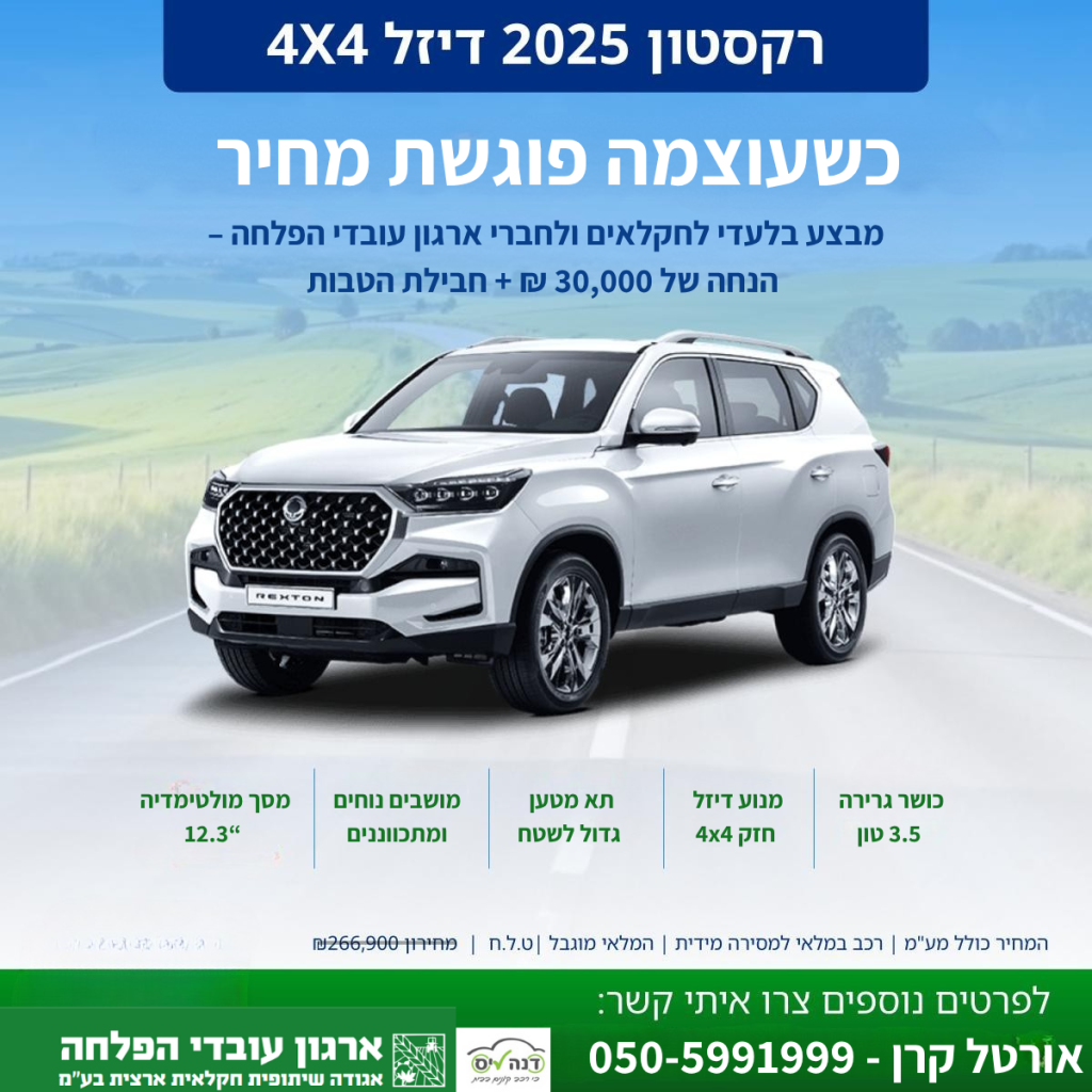 רכב רקסטון דיזל 4X4 2025 שיתוף פעולה חדש עם חברת דנה ליס ארגון עובדי הפלחה
