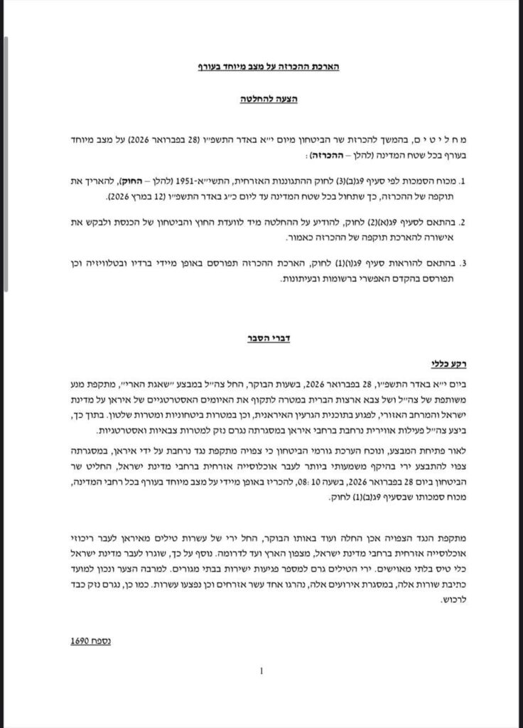 הארכת ההכרזה על מצב מיוחד בעורף – מבצע “שאגת הארי”